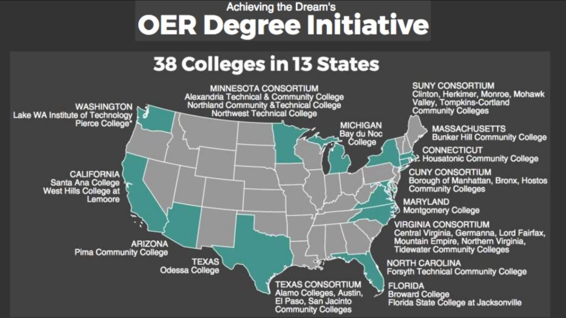 The largest open educational resources (OER) degree initiative to date was launched by Achieving the Dream (ATD), the national community college reform network, in June 2016. Involving 38 colleges in 13 states, it sought to remove barriers to student success and degree completion by alleviating financial burdens on students and enhancing teaching and learning through improved course redesign. A competitive grant application was submitted by colleges that committed to developing one or more OER degrees over the 31 months.