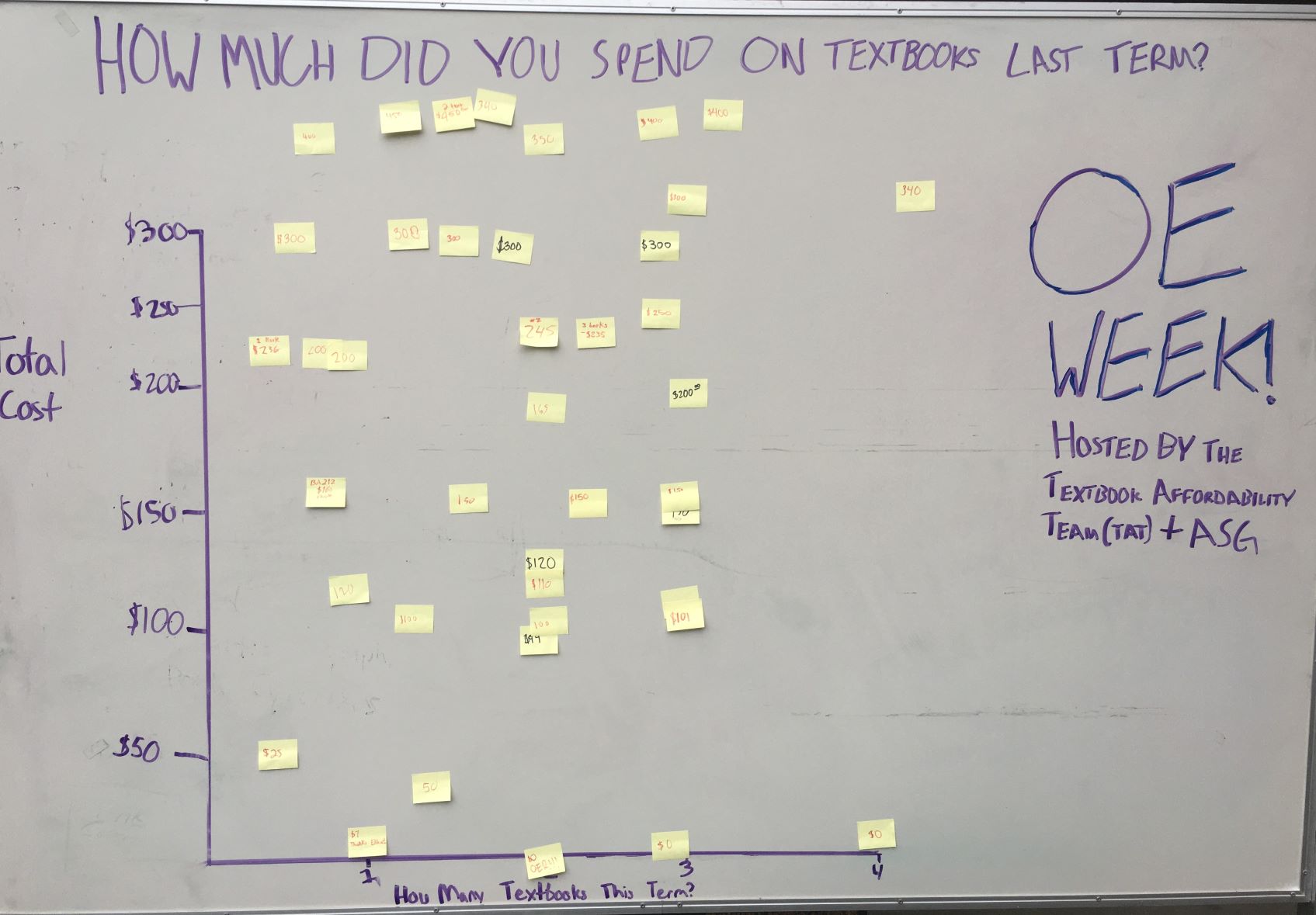 Whiteboard with question, “How much did you spend on Textbooks?” with notes posted by students on how much books cost them.