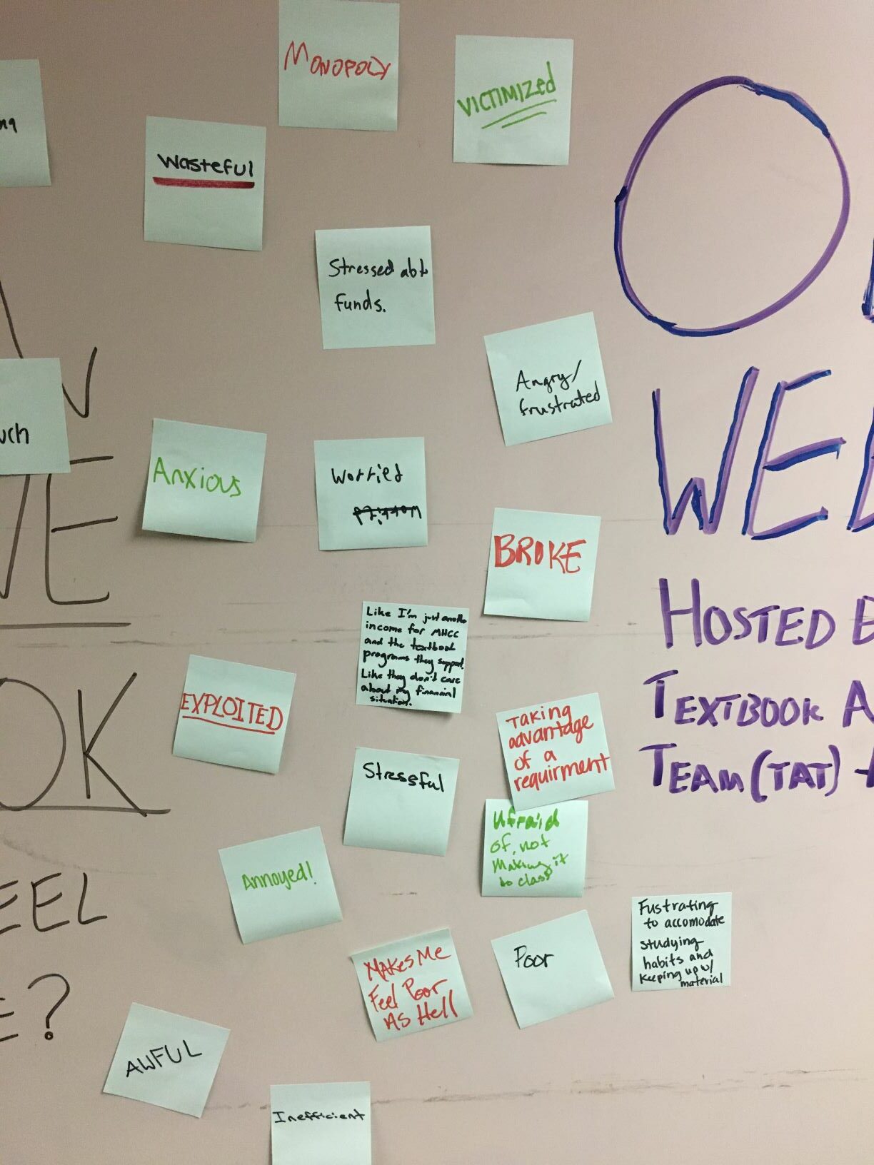 OEW20 – right side of whiteboard close up of students’ answers to “How do expensive textbooks make you feel?