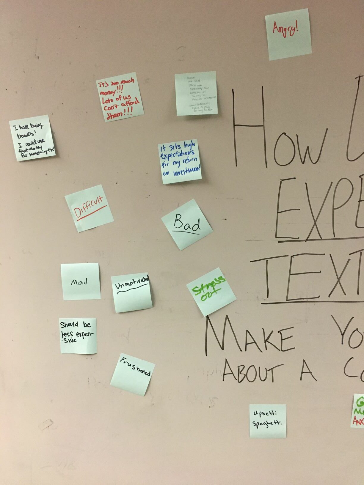 OEW20 – left side of whiteboard close up of students’ answers to “How do expensive textbooks make you feel?